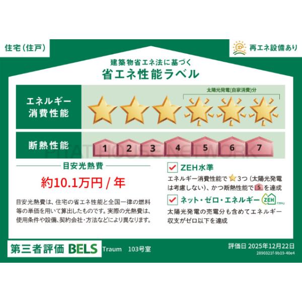 | その他 | 省エネ性能表示におけるZEH-Mの評価取得物件(エネルギー消費量画像参照) ZEH-Mにお住まい頂く事で高断熱による快適な暮らしと省エネ設備による光熱費の削減が実現できます。 My Concier Club非加入の場合別途口座振替手数料前払い有(200円×23カ月分) / ペットを飼育される場合別途ペット審査をお受けいただきます。物件毎に飼育頭数基準が異なりますので事前にお問い合わせください。 | ||||